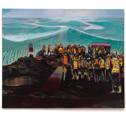 Peinture à l'huile, fusain, crayon, savon vert sur panneau de bois, 151 x 122 cm.